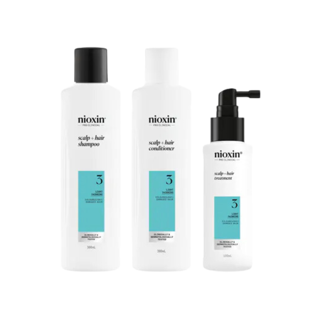 Nioxin Pro Clinical's System Kit 3 is designed for dry, damaged, coloured hair with light thinning. Clinically and dermatologically tested, this complete scalp & hair thickening system thickens and strengthens your hair against breakage while providing color protection. 8 out 10 users saw thicker, fuller hair in 30 days!